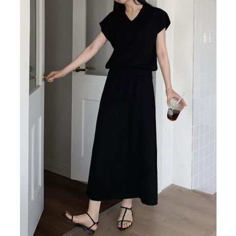 Vネックの抜け感と女性らしいシルエットが魅力のニットセットアップ。