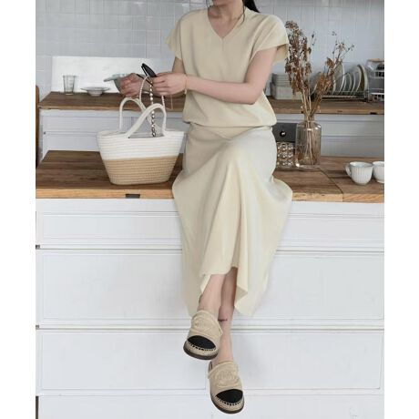 Vネックの抜け感と女性らしいシルエットが魅力のニットセットアップ。