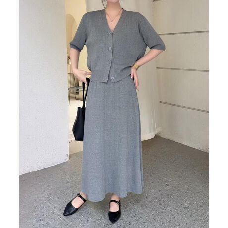 トップスはVネックのカーディガンで、前開きボタンがアクセントに。