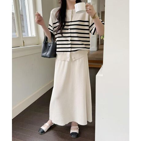 トップスはショート丈のカーディガンで、程よくゆとりのあるシルエットがリラックス感を演出。