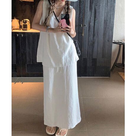 ゆったりとしたノースリーブトップスとロングスカートのセットアップ。