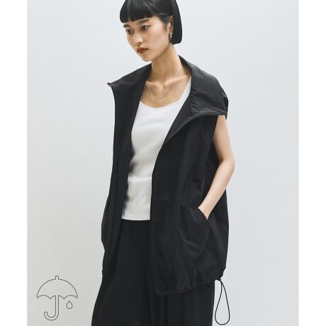 胸の切り替えや立体感のある肩タック仕様、フロントの止水ファスナーデザインが魅力のスリーブレスブルゾン。