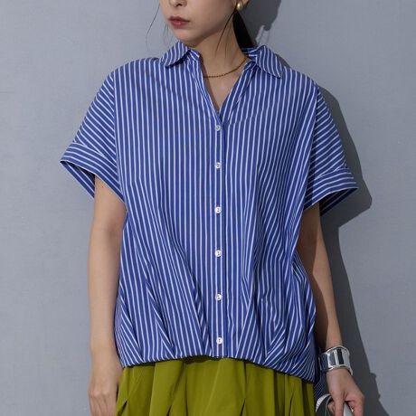裾のタックデザインで立体的なシルエットを作り、スキッパータイプはデコルテラインをシャープにスッキリとした印象にしてくれます。