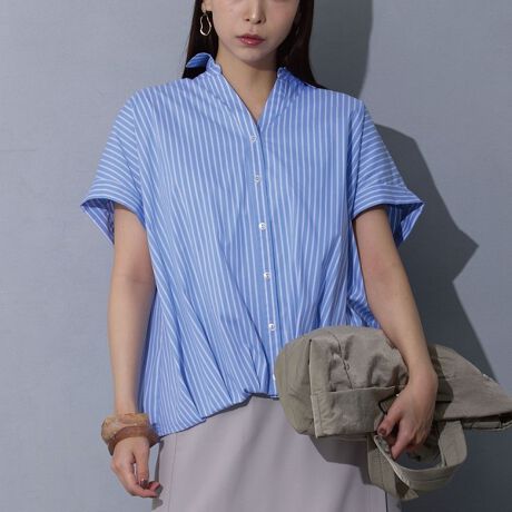 裾のタックデザインで立体的なシルエットを作り、スキッパータイプはデコルテラインをシャープにスッキリとした印象にしてくれます。