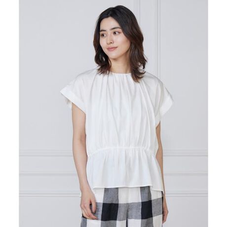 ・シャーリングデザインが映える1枚で華やかなアイテム・ウエストシャーリングはボディーラインを拾わないサイジングでスタイルアップ・二の腕が隠れる丈のフレンチスリーブ・後衿はボタンあき仕様・前後差のあるヘムラインで抜け感あるスタイリングを叶えます・水洗い可■サンプル撮影商品■こちらの商品はサンプルでの撮影となっております。実際の商品とは、サイズや色味、素材、デザイン等の仕様が若干変更になる場合がございます。