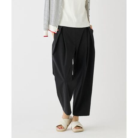 バレルシルエットが特徴的なカーヴィパンツです。ウエストのタックを斜めに施すことで独特のシルエットを実現しています。脇をカーブさせることで、程よくゆとりがあり快適に着用することができます。レッグラインを拾わない程よいボリュームで印象的なスタイリングを後押ししてくれるアイテムです。・水洗い可・ウエスト後ろゴムブラウス品番:1052182017ワンピース品番:1052121020スカート品番:1052152018■素材■コットンライクな薄手のウェザーストレッチ素材です。タテ糸にリサイクルポリエステル糸を使用しています。コットンのようなナチュラルな表情感と風合い、さらっとした肌触りが特徴です。吸水速乾性とヨコ方向へ優れたストレッチ性を持ち、お手入れ簡単で快適な着心地を提供します。サスティナブル性と機能性を併せ持ったハイスペックな素材です。