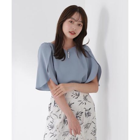 チューリップスリーブがオトナ可愛いブラウス。袖は気になる二の腕をカバーするので、通勤オフィスシーンにもぴったりなデザイン。襟ぐりはデコルテラインをキレイに見せるカットを入れ、フロントにはキラパール調ボタン付きで品よく着ていただけます。