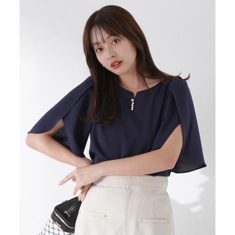 チューリップスリーブがオトナ可愛いブラウス。袖は気になる二の腕をカバーするので、通勤オフィスシーンにもぴったりなデザイン。襟ぐりはデコルテラインをキレイに見せるカットを入れ、フロントにはキラパール調ボタン付きで品よく着ていただけます。