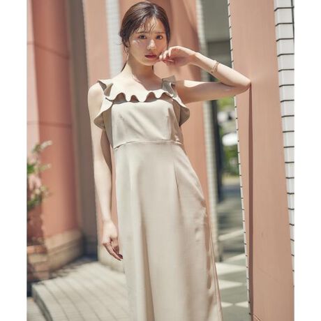 大きく開けた襟まわりにラッフル使いが映えるワンピース。ウエスト位置を高めに切り替えているので脚長効果を期待できます。すっきりとしたナローシルエットの後ろはセンタースリット入りで足さばき良く、後ろウエストはゴム仕様なので着心地も良いです。カーディガンを肩掛けしたり、バッグなどの夏小物を取り入れるのもお勧めです。
