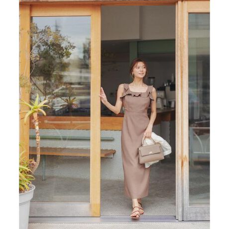 大きく開けた襟まわりにラッフル使いが映えるワンピース。ウエスト位置を高めに切り替えているので脚長効果を期待できます。すっきりとしたナローシルエットの後ろはセンタースリット入りで足さばき良く、後ろウエストはゴム仕様なので着心地も良いです。カーディガンを肩掛けしたり、バッグなどの夏小物を取り入れるのもお勧めです。