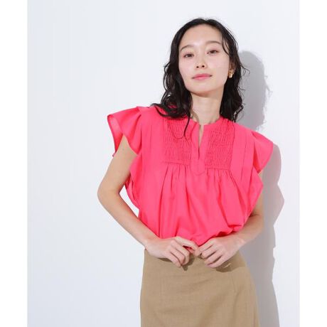 胸元のシャーリングや袖のフリルデザインが華やかなブラウス。身頃は肌離れするので夏も着やすいシルエット。大人っぽくガーリーな印象で、シンプルなボトムスと合わせるだけで着映えする主役級アイテムです。<素材>やや透け感のがありナチュラルな印象の素材を使用しています。<詳細>仕様・開閉なし裏地・なし透け感・ややあり / 光沢・なし / 伸縮性・なし生地の厚さ・普通※モデルの着用画像の場合、光の当たり具合により、実際の色味と異なって見えることがございます。色味は、商品単体の画像をご参照ください。