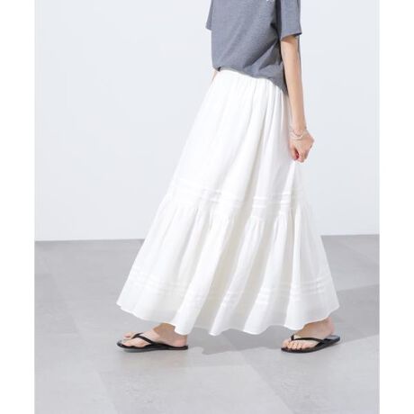 ティアード切り替えとタックがアクセントになったロングスカート。甘めのデザインですが、ナチュラルな印象の素材を使用することでカジュアルな雰囲気です。後ろウエストはゴム仕様、軽くリラクシーなはき心地です。<素材>シワ感が特徴の楊柳素材を使用しています。<詳細>仕様・開閉なし裏地・あり透け感・ややあり / 光沢・なし / 伸縮性・なし生地の厚さ・薄手※モデルの着用画像の場合、光の当たり具合により、実際の色味と異なって見えることがございます。色味は、商品単体の画像をご参照ください。