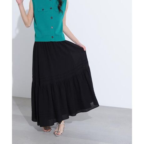 ティアード切り替えとタックがアクセントになったロングスカート。甘めのデザインですが、ナチュラルな印象の素材を使用することでカジュアルな雰囲気です。後ろウエストはゴム仕様、軽くリラクシーなはき心地です。<素材>シワ感が特徴の楊柳素材を使用しています。<詳細>仕様・開閉なし裏地・あり透け感・ややあり / 光沢・なし / 伸縮性・なし生地の厚さ・薄手※モデルの着用画像の場合、光の当たり具合により、実際の色味と異なって見えることがございます。色味は、商品単体の画像をご参照ください。