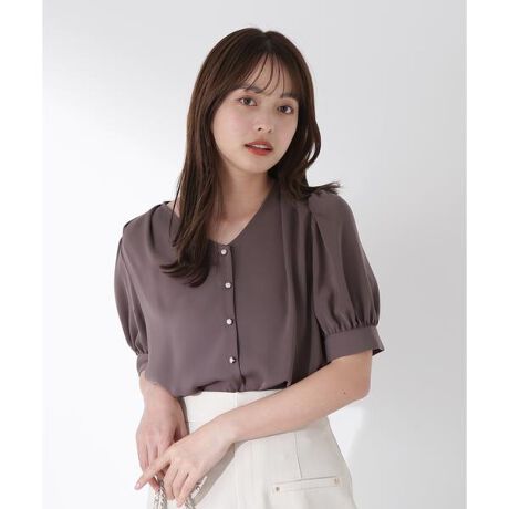 さり気ないキラキラ釦がオトナ可愛いブラウス。肩のタックとVネックデザインとのバランスが良く、着るだけで目を引くディテールに。袖は膨らみがあり、気になる二の腕をカバーします。シワになりにくい素材はデイリーにも通勤オフィスシーンにも活躍できます。