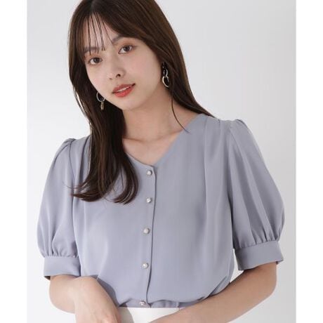 さり気ないキラキラ釦がオトナ可愛いブラウス。肩のタックとVネックデザインとのバランスが良く、着るだけで目を引くディテールに。袖は膨らみがあり、気になる二の腕をカバーします。シワになりにくい素材はデイリーにも通勤オフィスシーンにも活躍できます。