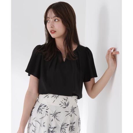 胸元のタックとパール調ディテールで顔まわりが華やぐブラウスです。レーヨン混率の高い生地を使用しているため、涼しげで肌触りがよく、やや光沢感も備えた素材を使用。また、ドレープ性にも優れているのでフレアスリーブのデザインも、女性らしい印象に見せてくれます。お仕事シーンにもキレイめなシーンにも着ていただけます。