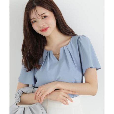 胸元のタックとパール調ディテールで顔まわりが華やぐブラウスです。レーヨン混率の高い生地を使用しているため、涼しげで肌触りがよく、やや光沢感も備えた素材を使用。また、ドレープ性にも優れているのでフレアスリーブのデザインも、女性らしい印象に見せてくれます。お仕事シーンにもキレイめなシーンにも着ていただけます。