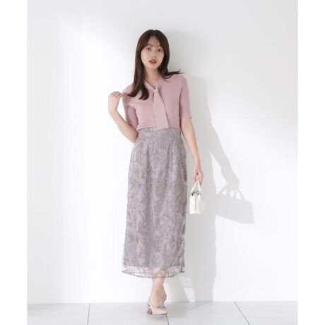 柄が入っているオーガンジーにツートンカラーの刺しゅうをあしらった上品なレーススカート。ナローラインが大人っぽく、シンプルながらも華やかなムードを演出します。後ろはセンタースリット入りで足さばきも◎。ブラウスやニットをウエストインするとバランス良く着ていただけます。