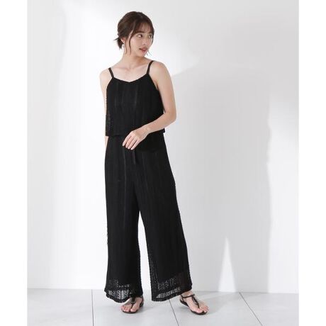 縦柄レースを使ったキャミロンパースです。コットンのように見えるポリエステル素材のレースを使っているので涼しげな雰囲気はそのまま、シワになりにくく、動きやすい1枚。セパレート見えしながら、キャミとパンツが一体化しているので、1枚でコーディネートが決まります。Tシャツの上に着てレイヤードしたり、1枚着としてシアーシャツやカーディガンを羽織るのもおすすめです。