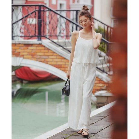 縦柄レースを使ったキャミロンパースです。コットンのように見えるポリエステル素材のレースを使っているので涼しげな雰囲気はそのまま、シワになりにくく、動きやすい1枚。セパレート見えしながら、キャミとパンツが一体化しているので、1枚でコーディネートが決まります。Tシャツの上に着てレイヤードしたり、1枚着としてシアーシャツやカーディガンを羽織るのもおすすめです。