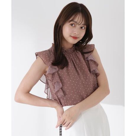華やかな雰囲気のドット柄ブラウスです。詰まったネックとフリル袖がバランス良く、女性らしさを演出。スカートはもちろん、スラックスやデニムパンツ合わせもおすすめです。
