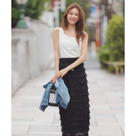 フリルとレースの組み合わせが大人フェミニンなタイトスカート。シンプルなデザインながらも、素材に特徴があるので、Tシャツやシャツを合わせるだけで様になる1枚。着こなしが甘くなりすぎないタイトラインと黒とホワイトカラー展開も魅力です。