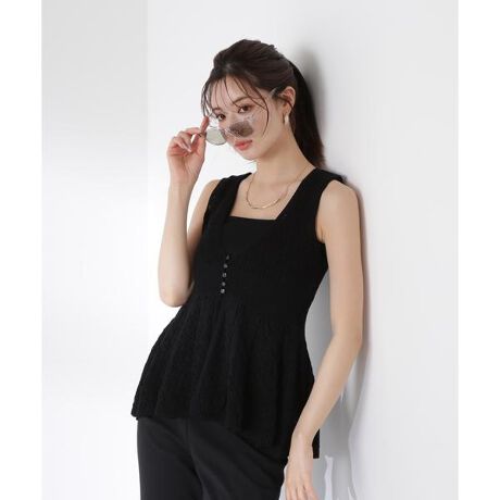 タンクトップと透かし編みニットを同色で揃えたセットアイテムです。透かし編みのニットは、ウエスト位置が高く見えるようにデザインし、気になるお腹まわりをカバーするペプラムシルエットです。フレアパンツとのコーディネートがお勧めです。
