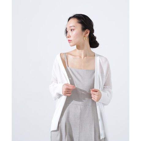 程よくゆったりとしたサイジングが心地よい、透け感のあるVネックカーディガン。メタルラインで縁取りされたボタンが、さり気なく華やかな印象をプラス。ワンピースはもちろん、スカートやパンツにも着回せるアイテムです。<素材>清涼感のある夏にぴったりなドライタッチの糸を使用しています。<詳細>仕様・前ボタン裏地・なし透け感・あり / 光沢・なし / 伸縮性・あり生地の厚さ・薄手※モデルの着用画像の場合、光の当たり具合により、実際の色味と異なって見えることがございます。色味は、商品単体の画像をご参照ください。