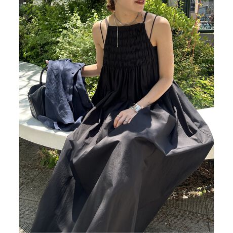 さらりとしたコットン生地をふんだんに使用し、胸元はハンドステッチでタックを寄せたディテールがアクセントになるキャミソールワンピース。Aラインシルエットなので体のラインを拾わず、リラックス感があり上品なアイテムです。