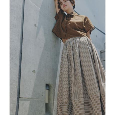 爽やかなストライプ柄が目を引くフレアスカートです。裾は地の目を変えた太めの切り替えを入れてアクセントに。ウエストはゴム仕様で楽なはき心地。ストライプ柄をいかして、Tシャツを合わせるだけでも様になるデザインです。<素材>ややハリ感のあるストライプ素材を使用を使用しています。<詳細>仕様・開閉なし裏地・あり透け感・なし / 光沢・なし / 伸縮性・なし生地の厚さ・普通※モデルの着用画像の場合、光の当たり具合により、実際の色味と異なって見えることがございます。色味は、商品単体の画像をご参照ください。