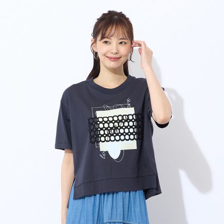 清涼感ある綿素材を使用したTシャツ。前身頃部分のプリントの上にあみあみのレース素材をドッキング。後衿はロープ状の紐を垂らしたクラフト感あるTシャツ。