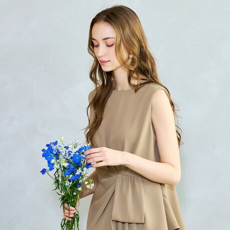 適度なハリ感と程よい肉感のダブルクロス素材を使用したノースリーブブラウス。微ストレッチ性がありウォッシャブルなイージーケア。前裾部分にリボン風の生地を垂らしたデザイン。
