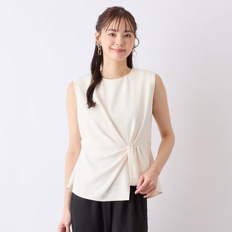 適度なハリ感と程よい肉感のダブルクロス素材を使用したノースリーブブラウス。微ストレッチ性がありウォッシャブルなイージーケア。前裾部分にリボン風の生地を垂らしたデザイン。