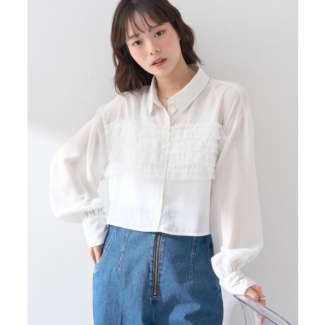 シアーなストライプ柄素材で仕立てたデザインシャツ。フロントに施したチュールフリルが程よく甘さをプラスして、サラッと着るだけでこなれた着こなしが完成します。短丈で旬なワイドボトムとも相性抜群。ボタンを開けて羽織物としても使え、合わせ方次第でロングシーズン活躍するおすすめのアイテムです。透け感[ややあり]