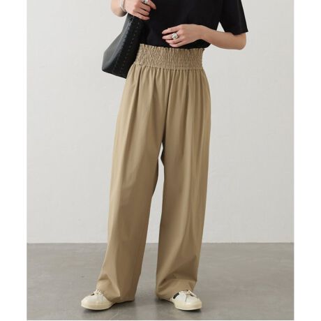 着心地:伸縮性のある素材でとても穿きやすい人気のパンツです。トップスをインして着用してもウエスト部分のシャーリングがとてもお洒落です。