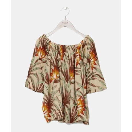ハワイを感じさせるカラフルさと、ボタニカル柄の2wayトップス。肌に張り付かずさらりとした着心地の綿レーヨンのクレープ素材は、暑い時期にぴったり。スカートやワンピースとのセットアップにも。