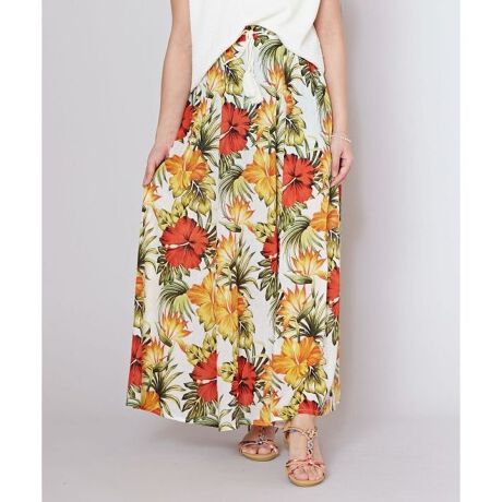 [型番:4IA-5243-2025]ハワイを感じさせるカラフルさと、ボタニカル柄のスカート。肌に張り付かずさらりとした穿き心地の綿レーヨンのクレープ素材は、暑い時期にぴったり。スカートやワンピースとのセットアップにも。