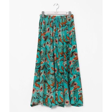 [型番:4IA-5243-2025]ハワイを感じさせるカラフルさと、ボタニカル柄のスカート。肌に張り付かずさらりとした穿き心地の綿レーヨンのクレープ素材は、暑い時期にぴったり。スカートやワンピースとのセットアップにも。