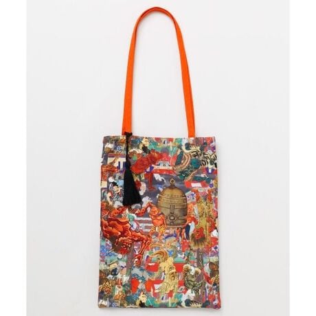[型番:7IKP5203-2025]すっきりとした平型シルエットのトートバッグ。浮世絵をコラージュした華やかな柄が目を引き、装いに和の彩りを添えます。長めの持ち手で肩掛けしやすく、内ポケット付きで使い勝手も良好。日常使いからおでかけまで幅広く活躍します。