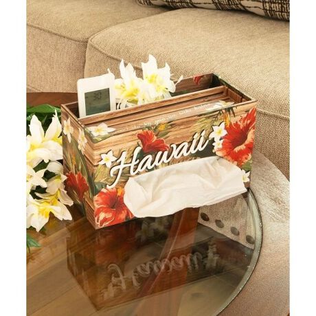 ハイビスカス、ホヌが描かれた箱型のティッシュケース。リモコンやペンなどを入れられるスペースもあり、ティッシュを入れる蓋部分はトレーになっているので、小物が置けて便利です。