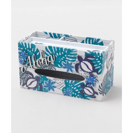 [型番:42HP5202-2025]ハイビスカス、ホヌが描かれた箱型のティッシュケース。リモコンやペンなどを入れられるスペースもあり、ティッシュを入れる蓋部分はトレーになっているので、小物が置けて便利です。