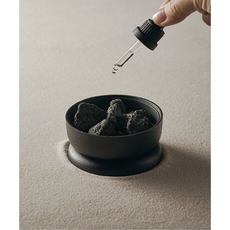 角の取れた丸いフォルムの器が包み込むのは、溶岩が凝固してできた荒々しく多孔質な性状の溶岩石です。蓋を取ってエッセンシャルオイル(アロマオイル)を数滴落とせば空間にオイルの芳香が広がります。