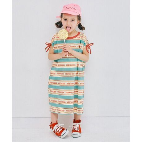 夏だいすきロゴボーダーシャーリングスリーブワンピース