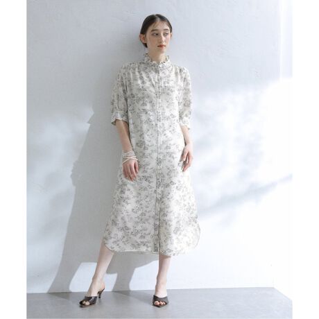 清涼感のあるリーフ柄のプリントが特徴的なバンドカラーのシャツワンピース。