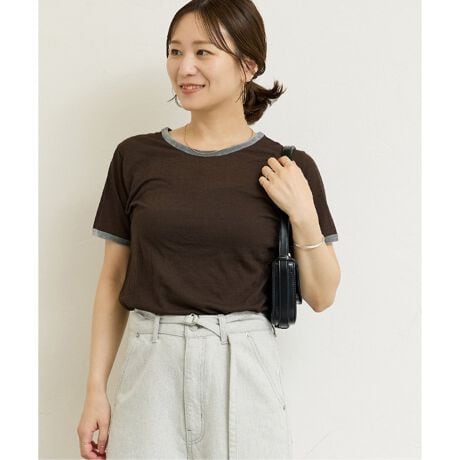 程よくシアーなボディにパイピング部分がベロアのリンガーT。