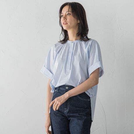 織物見えするカットソー素材を使用した、さらりと涼しいバンドカラーブラウス。