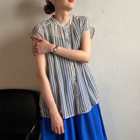 縦ラインを強調するストライプ柄が映える軽やかなブラウス。