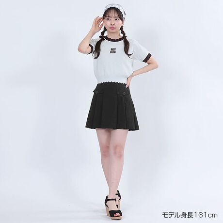 襟、袖、裾のスカラップがほど良い抜け感を演出するニット・プルオーバー。◆ポイント・コンパクトなサイズ感・さり気ない透け感が楽しめるメッシュ編み・レトロな配色・FRONTには襟、袖口と同色のロゴ刺繍入り・半袖◆カラー展開・ブラック×ホワイト・ホワイト×レッド・ブルー×ブラウン◆コーディネートスカートと合わせて甘めカジュアルな着こなしに。[型番:225-702804]