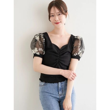フラワー刺繍をあしらったシアーなパフスリーブが甘めのアクセントになるトップス