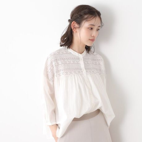 胸元から肩にかけて、繊細なリバーレースを贅沢に使用したブラウス。